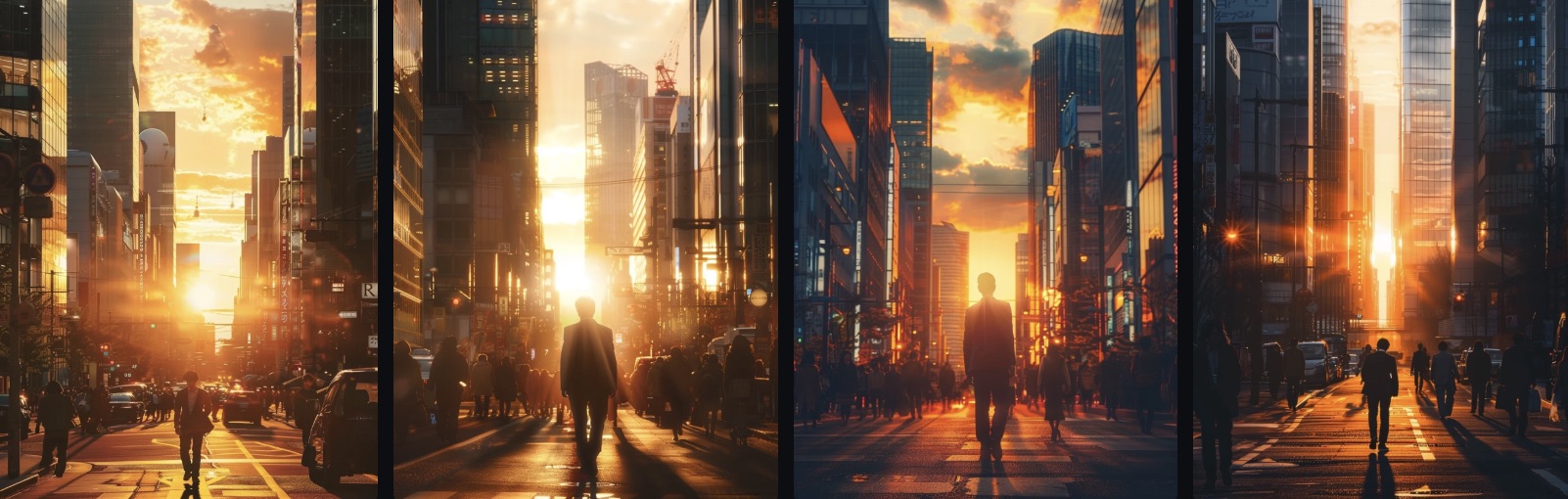 "A businessman walking alone in downtown Tokyo at sunset. The sky is glowing orange, sunlight reflecting off glass buildings. The streets are crowded with people and cars, and the man looks isolated despite the crowd. Realistic lighting."